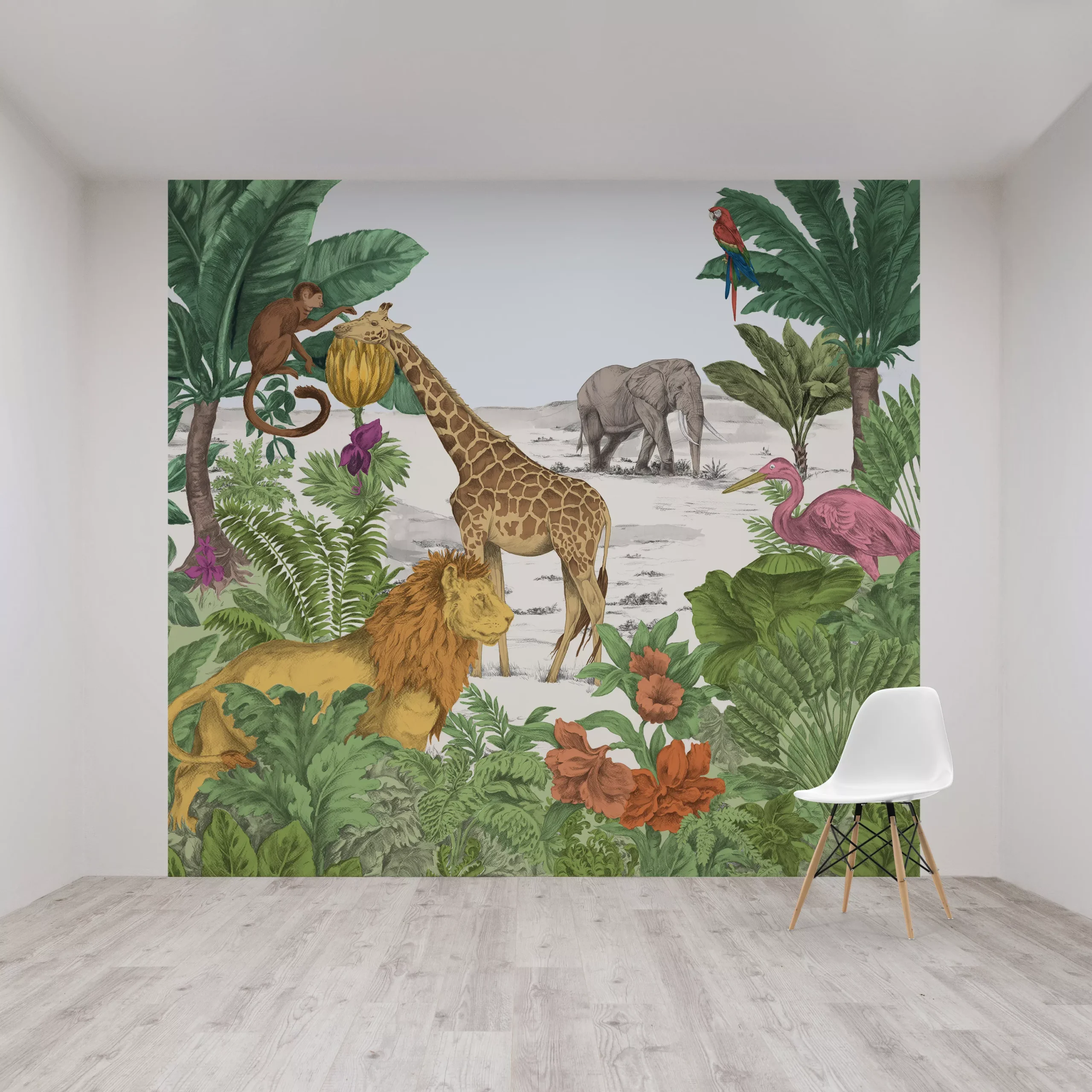 This beautifully hand painted jungle animal mural will add a splash of colourful fun to your child’s bedroom. The mural measures 300cm wide by 280cm tall and comes in one easy to use roll (1 roll = 1 mural). It is also supplied with a set of easy to follow hanging instructions. In order to remove, it simply peels off in one strip therefore no steamer or scraper is required.