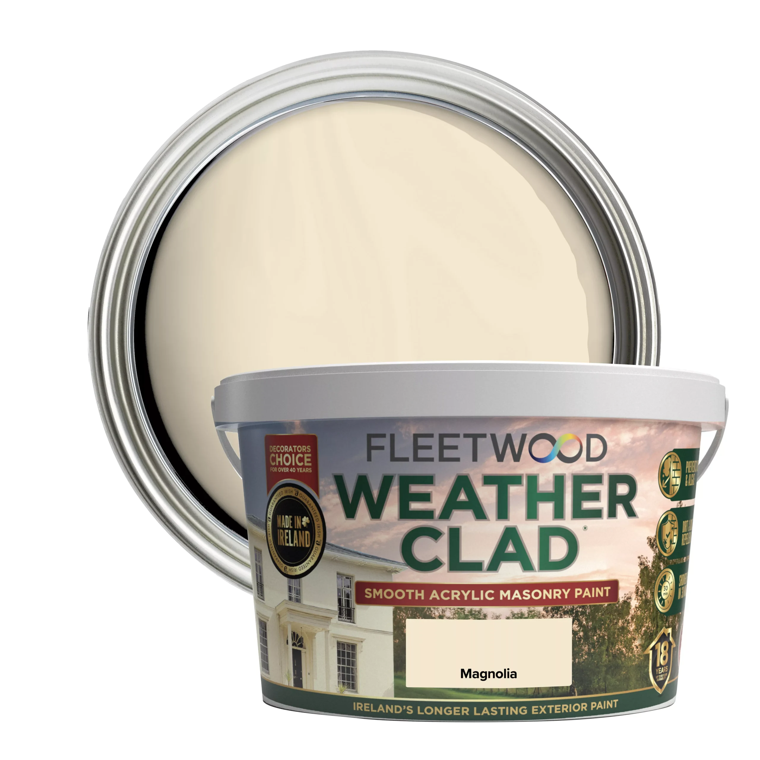Fleetwood Weather Clad in Magnolia is the perfect choice for keeping your home looking beautiful throughout the year. This smooth emulsion paint is formulated on an acrylic modified emulsion system to provide a long-lasting and protective finish for all kinds of exterior masonry surfaces. Along with a low VOC level, this paint is designed to resist cracking, dirt, mould & algae, stains, ultraviolet radiation and scratching – offering you top quality protection from damage caused by harsh weather conditions. Tested in Ireland.